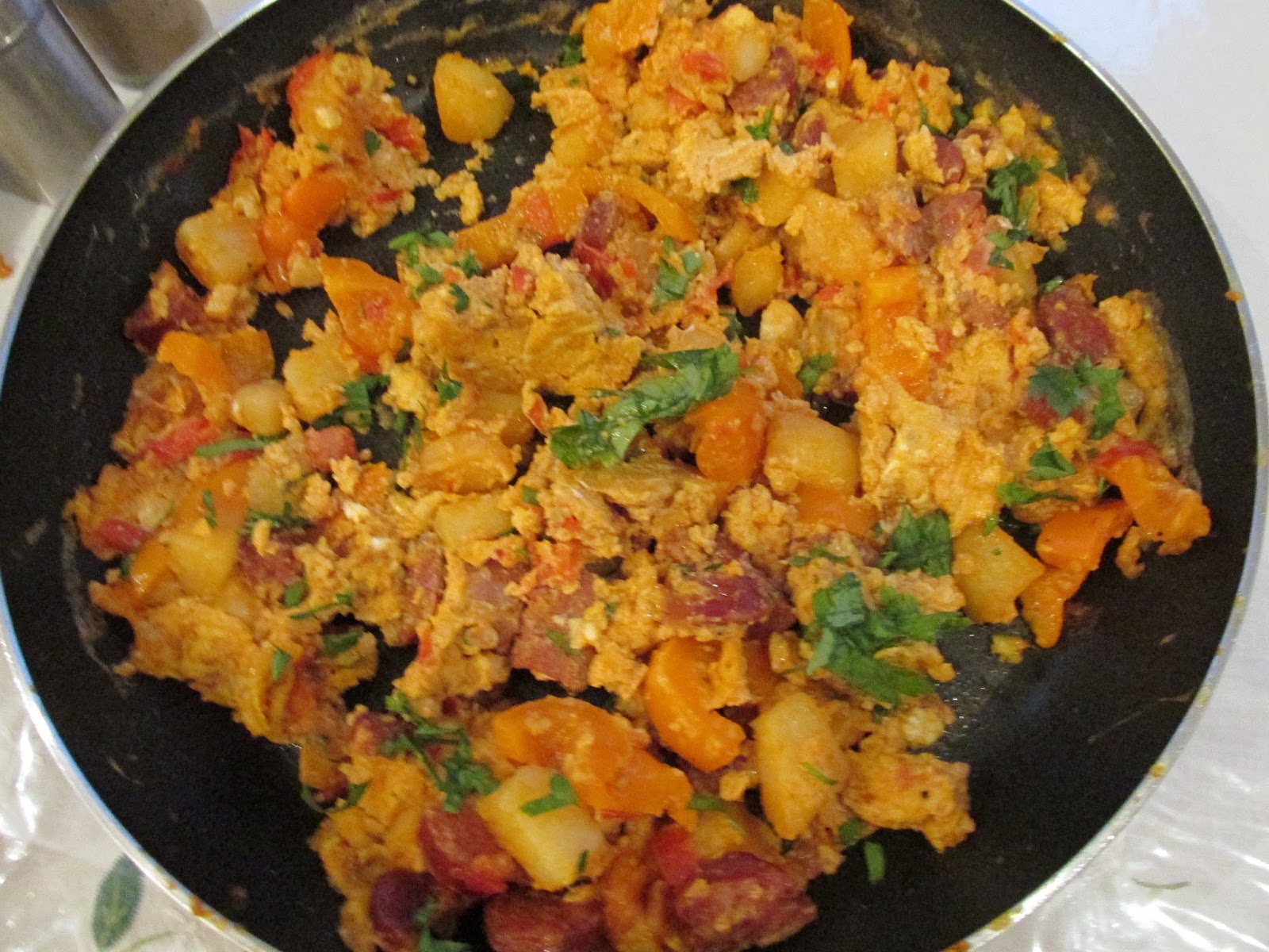 Pour the olive oil into a non-stick frying pan and add the chorizo sausage. Stir with a wooden spoon occasionally and when the red coloured oil comes out of the sausage, it is time to add the cayenne, cumin, salt and pepper, garlic and fry for two minutes. Add the tomatoes, a dash of water, followed by the beaten eggs.